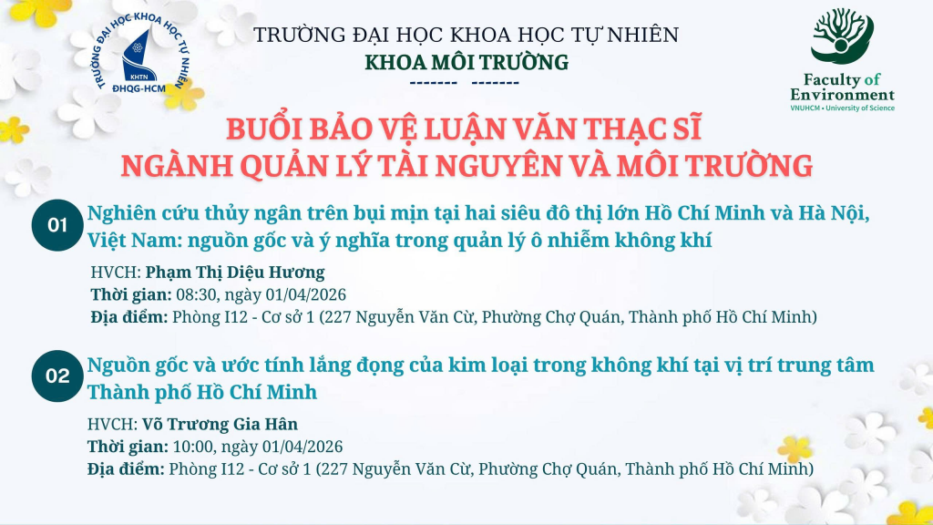 Khoa Môi trường trân trọng thông báo buổi bảo vệ luận văn Thạc sĩ ngành Quản lý Tài nguyên và Môi trường đợt tháng 04/2026.