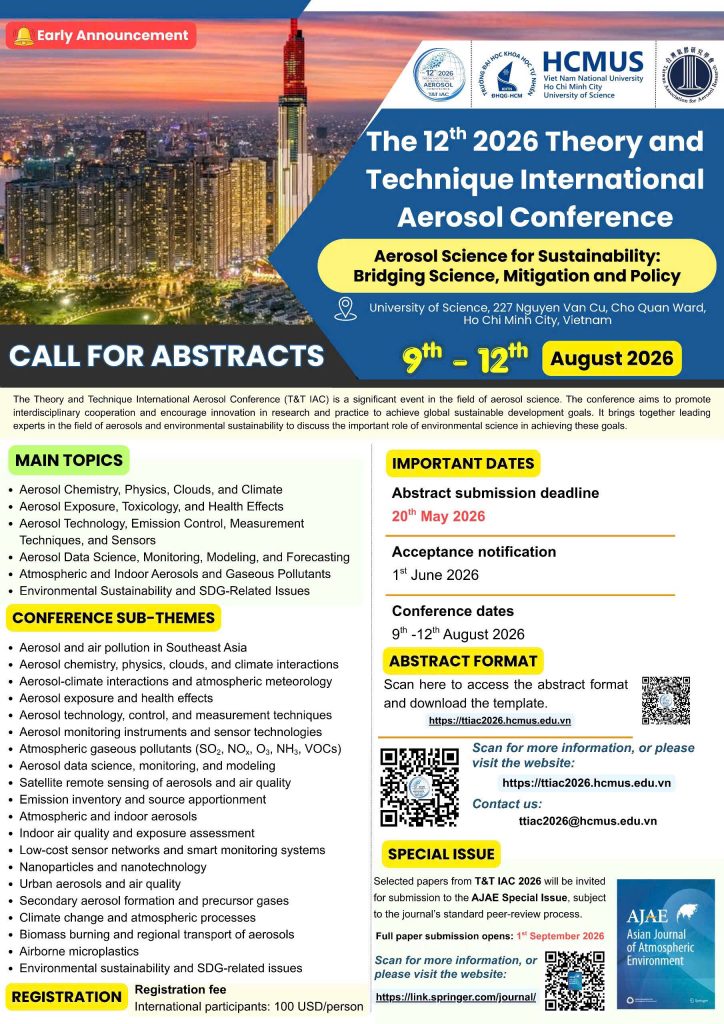 Khoa Môi trường trân trọng thông báo thời gian gửi tóm tắt (abstract) cho hội nghị 12th Theory and Technique International Aerosol Conference (T&T IAC 2026), sẽ được tổ chức từ 09 – 12/08/2026 tại Trường Đại học Khoa học Tự nhiên, Đại học Quốc gia TP. Hồ Chí Minh, Việt Nam.